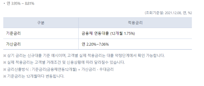 기준금리는 금융채 연동 대출로 12개월 기준 1.75% / 가산금리는 연 2.20%~7.06%다. 연체금리는 최도 15%까지 부과되나 연체할 경우 한정하며 아래와 같이 연체 가산이자는 3%다.