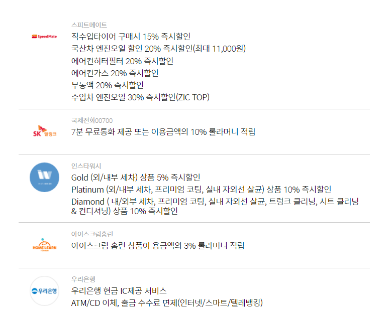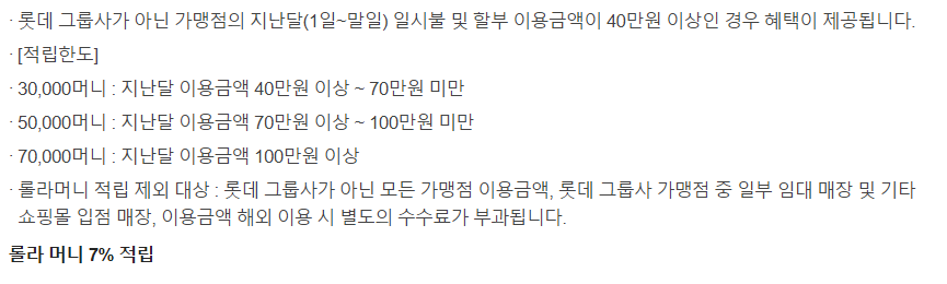 롯데백화점, 롯데마트, 롯데슈퍼, 롯데면세점, 롯데홈쇼핑, 롯데월드, 롯데시네마, 세븐일레븐 등 롯데계열사를 통한 카드 사용 시 7%의 적립을 해 주는데 적립된 롤라 머니는 엘포인트(L.POINT) 전환하여 사용이 가능하다. 최대 적립이 가능한 월 롤라 머니는 총 7만 원이다. 게다가 SK 주유소에서 주유 시 1%의 적립이 가능한데 자세한 내용은 아래에서 확인하자.