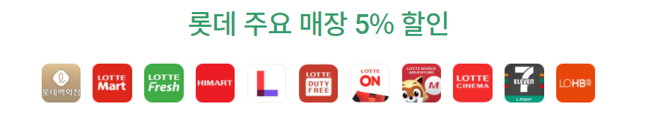 롯데 그룹사 결제시 롤라 머니 7% 적립 가능과 롯데 주요 매장에서 5%의 할인이 가능하다. 백화점에서 편의점까지 할인을 받기에 이용하는 재미가 있다.
