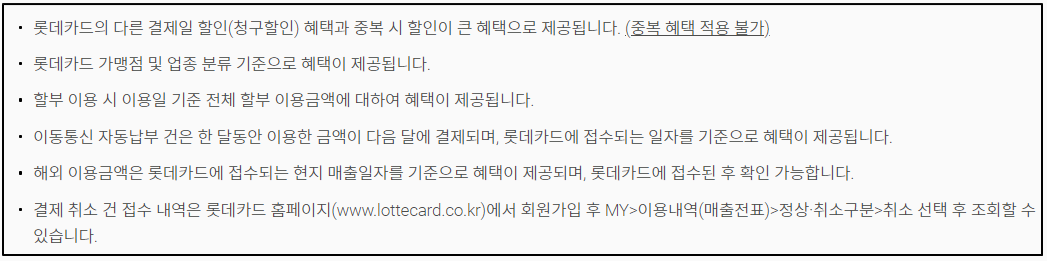할인기준은 롯데카드 가맹점인데 모든 가맹점 할인과 온라인 할인이 중복 적용되지 않고 할인이 큰 쪽의 혜택을 제공한다. 단, 할인 대상이 되지 않는 결제는 국세, 지방세, 도시가스비, 공과금, 건강보험, 국민연금, 고용보험, 산재보험, 등록금, 관리비, 스마트 캐시백, 무승인전표, 장단기 카드대출, 과태료, 수수료, 연회비 등은 적용이 없다.