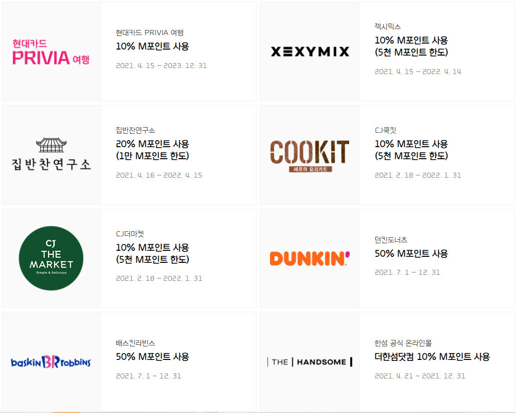 배스킨라빈스, 던킨도너츠, 한섬 닷컴, cj더 마켓, 집반찬연구소, 프리바 여행, 쿡킷, 젝시믹스 등에서 사용 가능하며 배스킨라빈스와 던킨에서 50% M포인트 사용 가능하다.