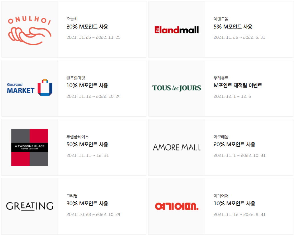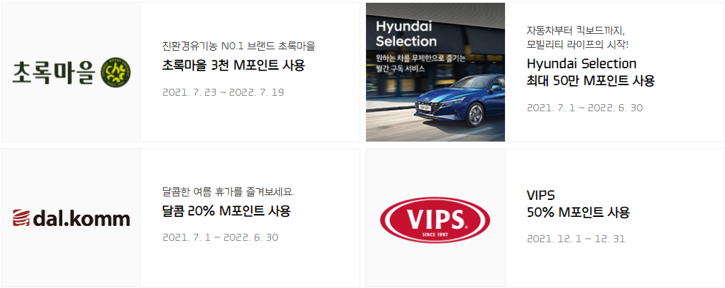 | 편의/쇼핑 | 지마켓, 올리브영, 위메프, 이랜드몰, 더현대닷컴, SSG닷컴, 젝시믹스, 집반찬연구소, 이마트, 노브랜드, 현대캐피탈인증중고차, 에뛰드하우스, 아이파크, 언더아머, 록시땅, 홈플러스 온라인 등 |