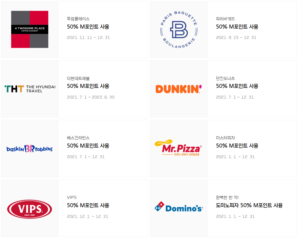 일상생활에서 가장 많이 사용하는 곳으로 선별하여 엠포인트로 50% 사용 가능한 매장은 아래와 같다. 파리바게트, 배스킨라빈스, 미스터피자, 던킨, 투썸, 파리바게트, 도미노 피자, 빕스, 피자헛, 파파존스 피자, 뚜레쥬르가 있다.