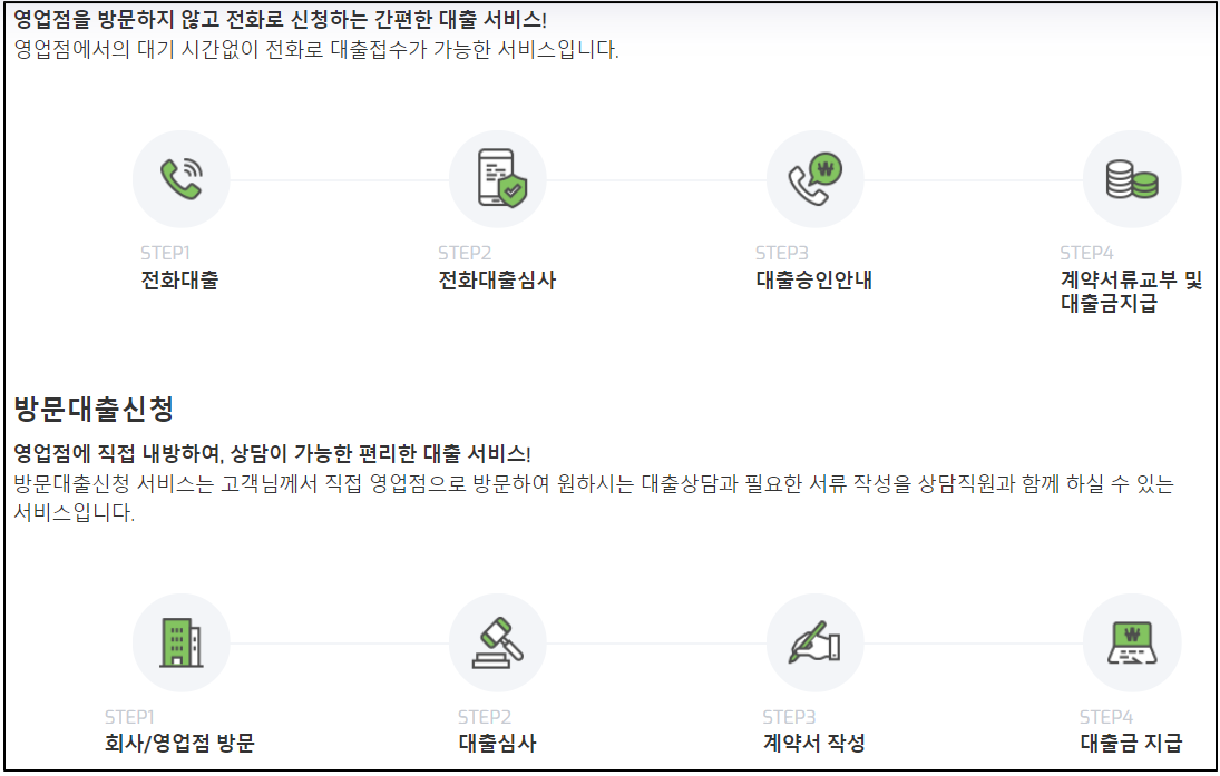 영업점 방문없이 전화로 간편하게 진행이 가능하며, 영업점을 직접 방문하여 상담과 심사 진해이 가능하기에 본인에게 맞는 방법으로 신청을 하면 된다.