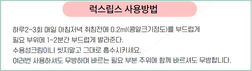 18세 이상의 성인 기준으로 미리 샤워후 하루에 1~3회 정도를 아침과 저녁으로 콩알만큼 바르고 1분에서 2분 전도 마사지를 해 준다. 그리고 씻어 낼 필요 없이 그대로 마사지하여 흡수시켜 주면 된다.