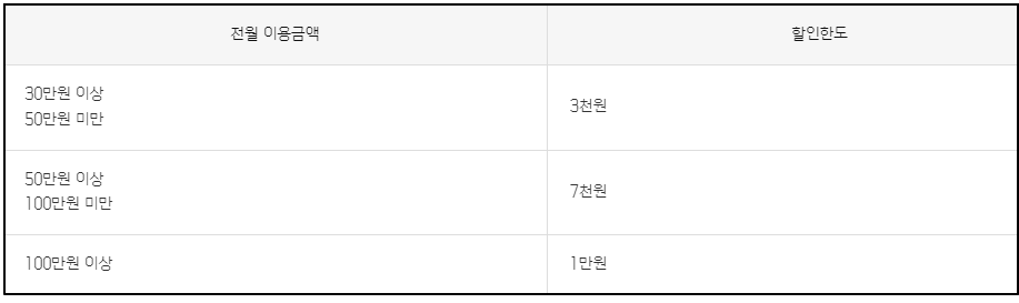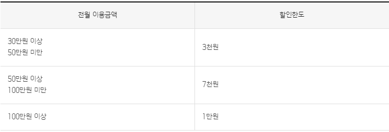 - 전월 이용금액 유실적 고객 대상으로 월 4회 20% 할인 제공한다.