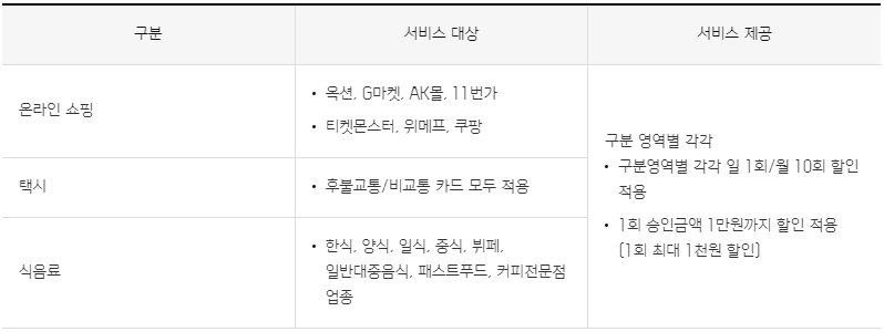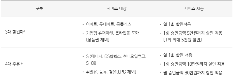 - 이마트, 롯데마트, 홈플러스, 기업협 슈퍼마켓, 온라인몰도 포함한다. 서비스 제공은 하루에 1번 할인 적용되며 1회 승인금액은 5만 원까지 할인이 적용되는데 1회 최대 할인은 5천 원이다.