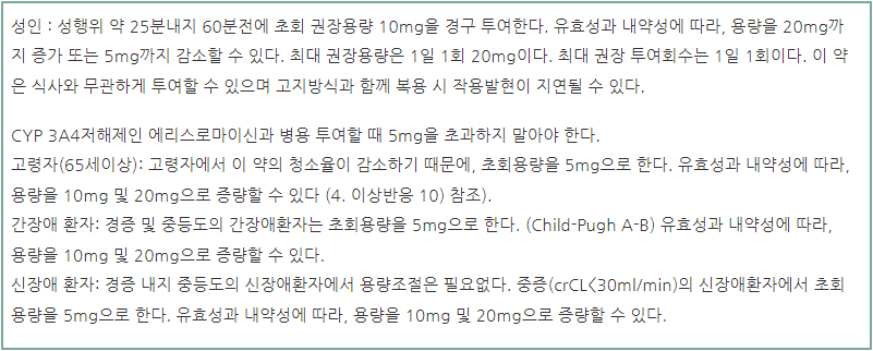 요약해 보면 성행위 약 25분에서 한 시간 전에 복용하는데 처음 복용 권장용량은 10mg입니다. 효과가 없다고 느낄 경우는 20mg까지의 용량을 증량 가능하며 부담된다고 느낄 경우 5mg까지 감량 가능합니다.