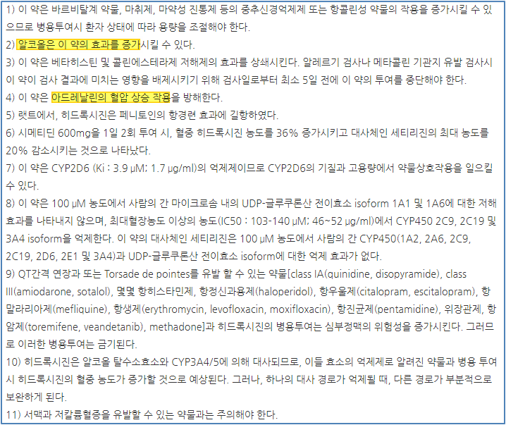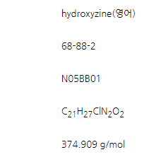이 성분은 항히스타민 1세대로 수술 후의 불안, 긴장, 초조 등에 복용하거나 두드러기, 피부염, 가려움 등의 피부질환에 복용하는 약입니다. 히드록시진 성분은 H-1 히스타민 수용체에 결합하는 것을 억제하여 진정작용을 나타냅니다.