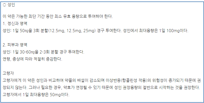 최대한 단기간에 복용하여 효과를 보이면 복용중지함을 권장합니다. 피부의 두드러기와 가려움에는 하루에 30~60mg을 아침과 점심만 1알씩 복용하던지 증상이 심할 경우 식후 3번을 복용할 수도 있다.