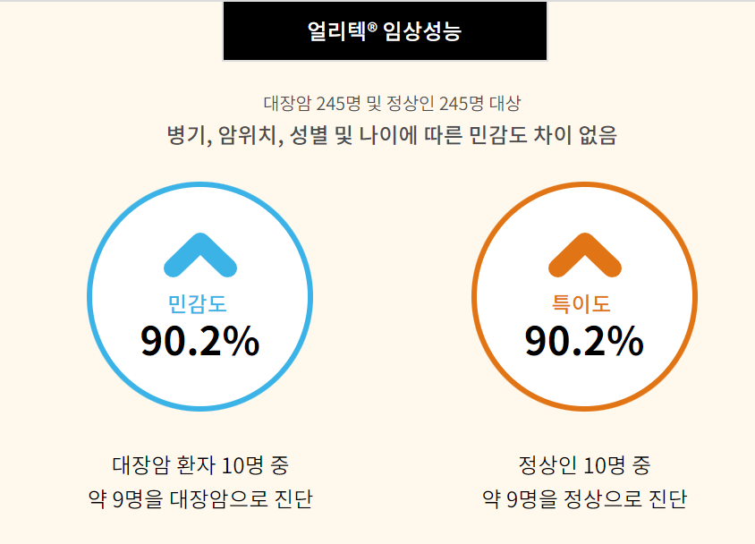 얼리 텍의 임상시험에서 대장암 환자 245명과 정상인 245명의 임상 성능을 보면 대장암 환자 10명 중 9명을 대장암으로 진단하였는데 암 위치나 성별, 연령에 따른 민감도 차이는 없습니다.