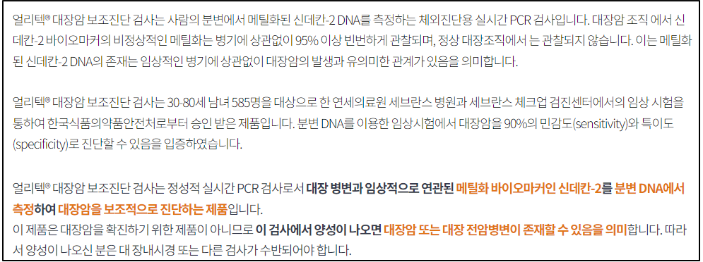대충 만든것이 아니면 이미 식품의약품 안전처로부터 체외진단용 의료기기 3등급의 허가를 받은 대장암 보조 진단 검사기기로 대장 내시경을 받지 않은 분들의 보조 검사방법으로 사용되고 있습니다.