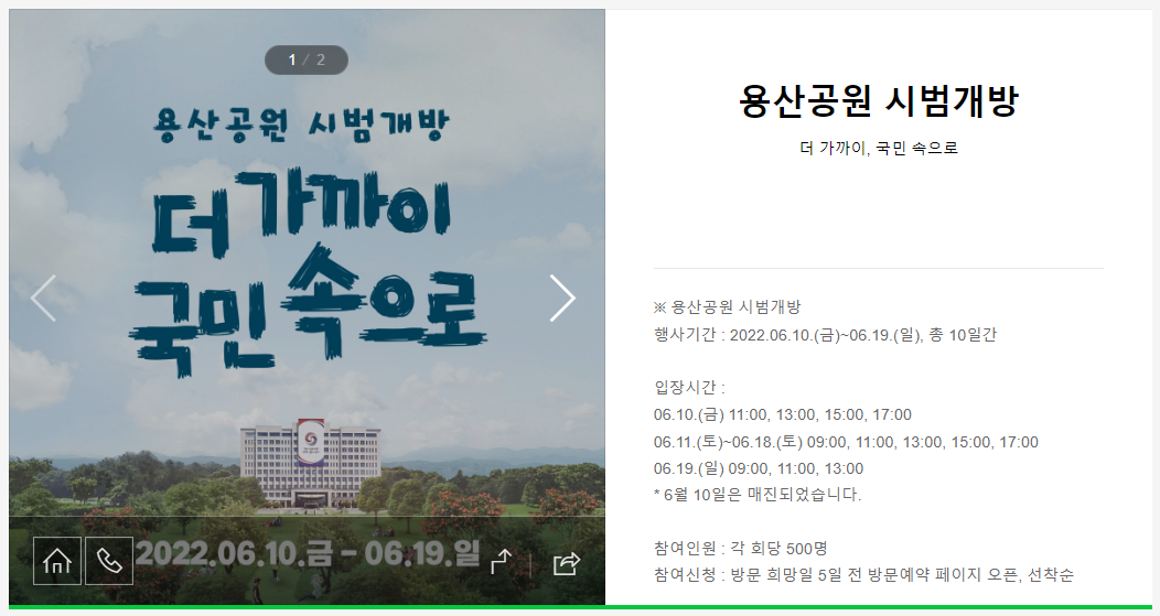 네이버 검색 용산공원 시범 개방이라고 해보면 최상단에 홈페이지가 바로 나온다. 여기서 아래 부분을 보면 예약을 할 수 있는데 이미 6월 10일 ~ 13일 가지는 예약이 모두 마감되었다.