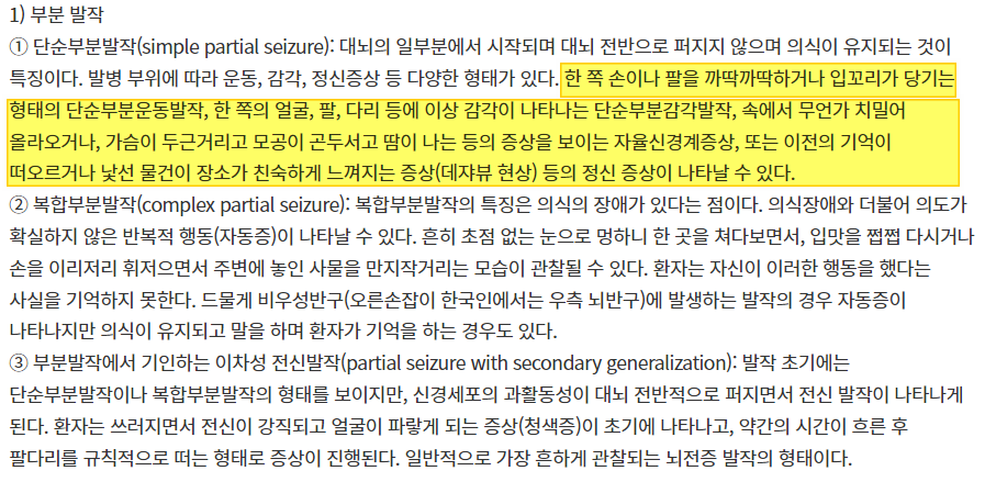 2. 부분발작 - 갑작스런 얼굴과 팔, 신체 일부분의 근육떨림과 이상증상