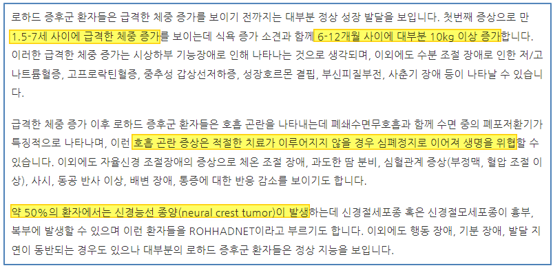 돌이 지난 아이가 갑작스러운 체중의 증가와 호흡장애를 겪는다고 하여 무조건 로하드 증후군은 아닙니다. 몇 년 전에 TV에 다온 프로그램을 유튜브에서 보고 로하드 증후군 문의가 많이 늘었다고 합니다. 현재 국내에서 2명 정도로 앓고 있으면 전 세계에선 100명 내외의 환자가 있는 희귀 질환입니다.