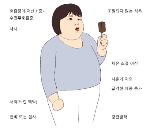 체중이 증가하는 이유는 뭔가를 계속 먹기 때문인데 시상하부의 포만중추와 음수 중추가 뭔가 문제가 생겼기에 먹는 것을 조절할 수가 없다.
