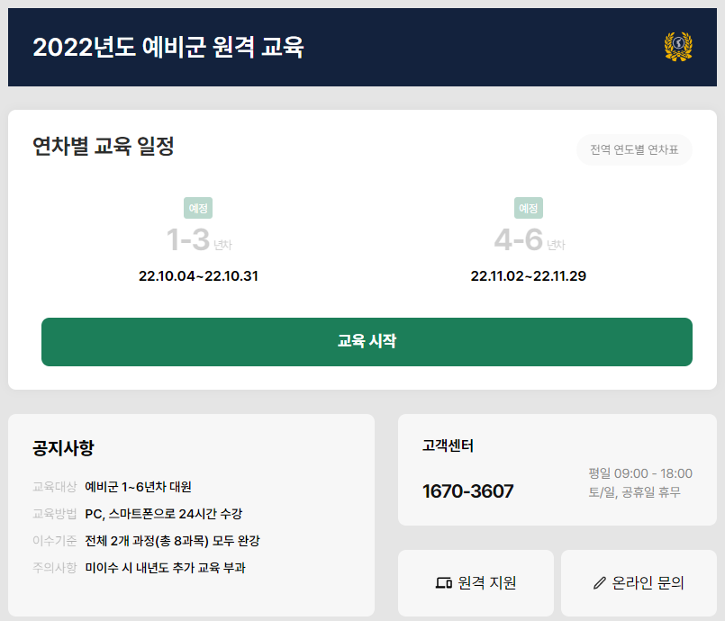 예비군 원격교육은 대상자 여러분들의 편의를 위한 제도라고 생각해도 무방합니다. 그 이유는 올해 진행되는 원격교육을 통하여 2023년도 소집훈련 시간이 축소될 수 있기 때문입니다.