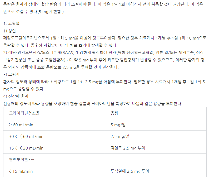 다만 울혈심부전 증상에 이 약을 처방받은 분들은 1회 2.5mg의 용량을 투약하게 됩니다. 보통 2주 정도 처방을 받게 되며 그 이후에 5mg으로 증량을 하던지 경과를 보고 결정하게 됩니다. 특히 간장애 환자라고 하여도 이 약의 용량조절은 필요가 없습니다.