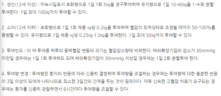 다만 이 약은 투여량 조절시 신중하게 접근하여 3일 정도의 간격을 두고 지켜보면서 투여량을 조절해야 합니다. 만약 신속한 고혈압 치료가 요구되는 경우는 환자를 잘 관찰하면서 6시간마다 투여량 조절이 가능합니다.