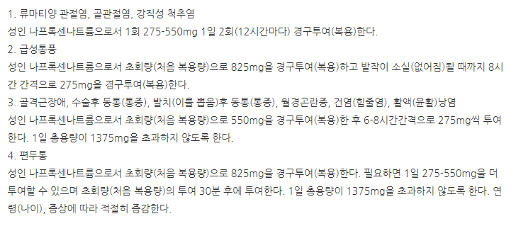나프록센나트륨 275mg을 사용하여 류마티양 관절염, 골관절염, 강직성 척주염, 건염, 급성통풍, 월경 곤란증, 타박상, 염좌, 허리통증, 수술 후 통증, 편두통, 발치 통증 등에 사용가능합니다.