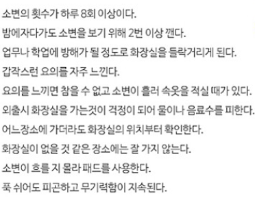 하루에 8번 이상의 소변을 보러 가시는 분들처럼 빈뇨증상을 겪는 분들