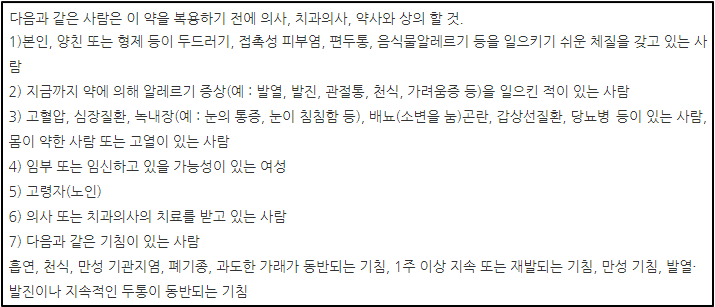 뿐만 아니라 이 약을 복용하기 이전에 현재 항우울제나 항정신병제, 감정조저레, 항파킨슨제 등을 복용하는 분들 또는 복용하다가 약을 끊은 지 2주가 되지 않은 분들은 이 약을 복용하지 않아야 합니다.