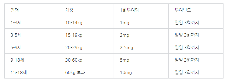 특히 성인 기준으로 수술 후 구토를 한다면 10mg 1회 투약으로 충분한데, 하루 최대 3회복용을 권장합니다. 그리고 1~18세 아이들의 경우는 체중당 0.1~0.15mg을 투약받을 수 있으니 아래와 같은 투약 용량을 확인 바랍니다.