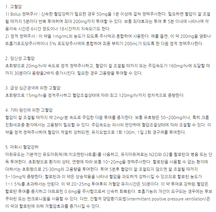 응급성 고혈압 증상에는 1분에 걸쳐 50mg을 정맥주사 하며, 필요시 혈압이 정상으로 올 때까지 5분마다 반복 투약을 하여 최대 20mg까지 투약 가능합니다.